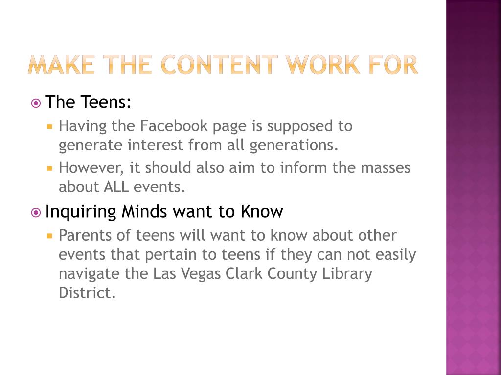 Make the Content Work For • The Teens: • Having the Facebook page is supposed to generate interest from all generations. • However, it should also aim to inform the masses about ALL events. • Inquiring Minds want to Know • Parents of teens will want to know about other events that pertain to teens if they can not easily navigate the Las Vegas Clark County Library District.