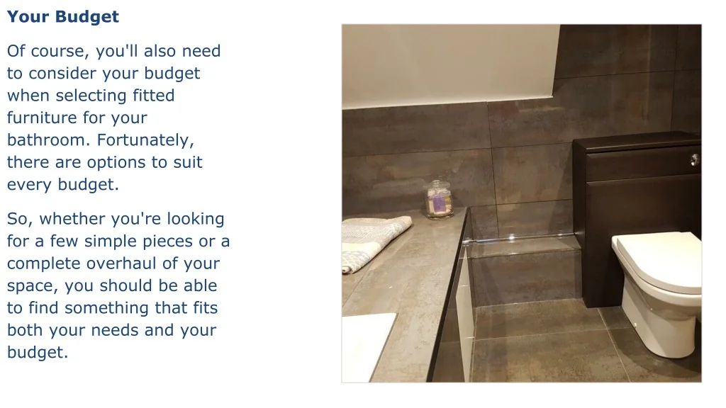 Your Budget Of course, you'll also need to consider your budget when selecting fitted furniture for your bathroom. Fortunately, there are options to suit every budget. So, whether you're looking for a few simple pieces or a complete overhaul of your space, you should be able to find something that fits both your needs and your budget.