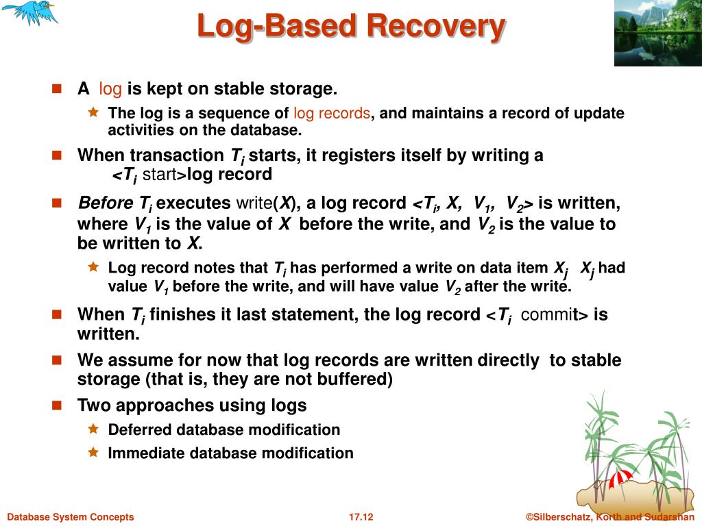 A log is kept on stable storage. The log is a sequence of log records, and maintains a record of update activities on the database. When transaction Tistarts, it registers itself by writing a <Tistart>log record Before Tiexecutes write(X), a log record <Ti, X, V1, V2>is written, where V1 is the value of X before the write, andV2is the value to be written to X. Log record notes that Ti has performed a write on data item Xj Xjhad value V1before the write, and will have value V2after the write. When Tifinishes it last statement, the log record <Ticommit> is written. We assume for now that log records are written directly to stable storage (that is, they are not buffered) Two approaches using logs Deferred database modification Immediate database modification Log-Based Recovery