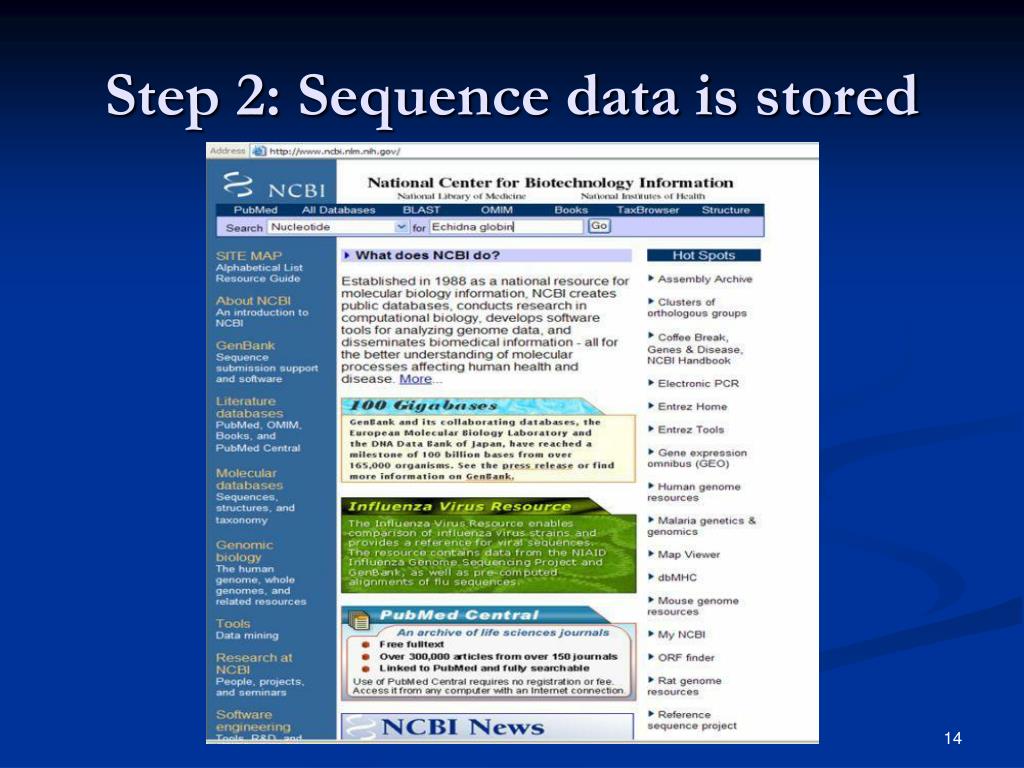 C G C A A T G A G C T A G G T C A T G G A Step 1: Scientists sequence the gene… Gene sequencing is used to determine the order of the base pairs in a segment of RNA or DNA . . . T T A C G A G G A G G G A A A G A A C T T T Each gene contains a triplet code for making a protein