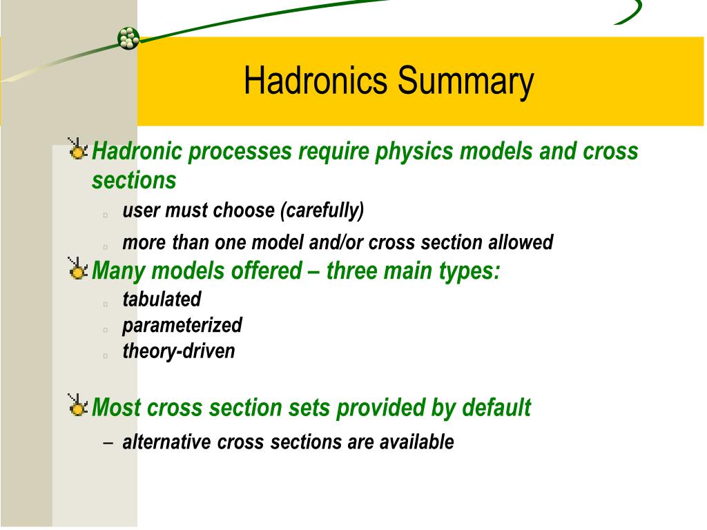 Hadronics Summary Hadronicprocessesrequirephysicsmodelsandcrosssections usermustchoose(carefully) morethanonemodeland/orcrosssectionallowed Manymodelsoffered–threemaintypes: tabulated parameterized theory-driven Mostcrosssectionsetsprovidedbydefault alternativecrosssectionsareavailable