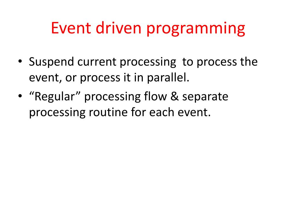 Event driven programming • Suspend current processing to process the event, or process it in parallel. • “Regular” processing flow & separate processing routine for each event.