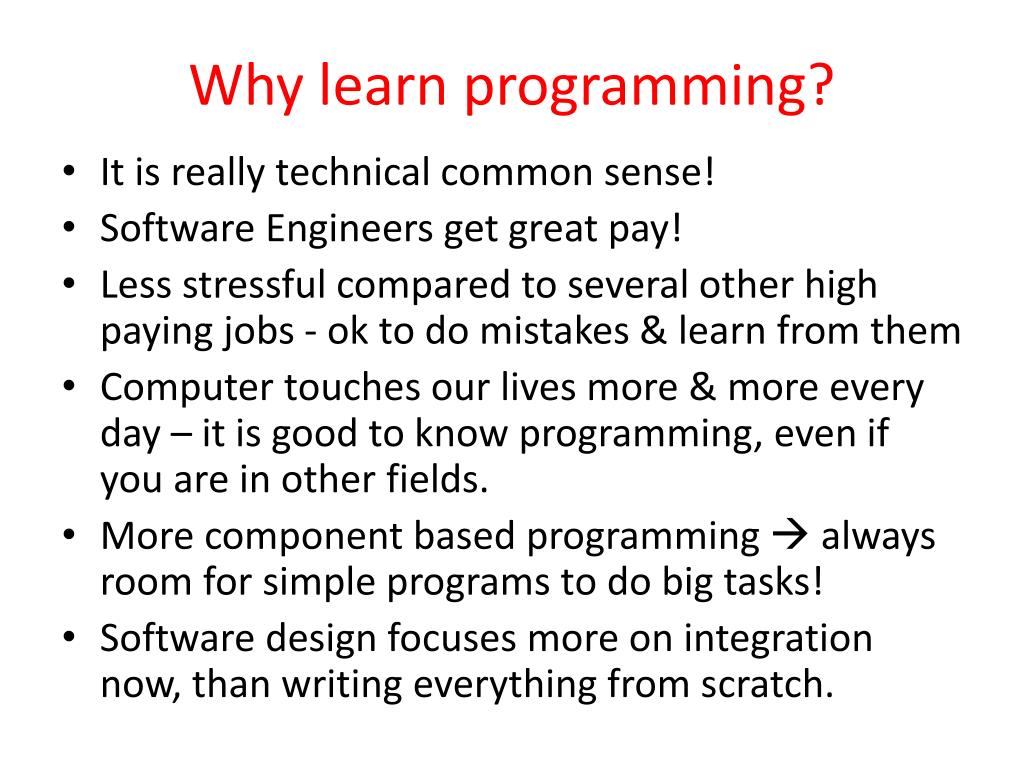 Why learn programming? • It is really technical common sense! • Software Engineers get great pay! • Less stressful compared to several other high paying jobs - ok to do mistakes & learn from them • Computer touches our lives more & more every day – it is good to know programming, even if you are in other fields. • More component based programming always room for simple programs to do big tasks! • Software design focuses more on integration now, than writing everything from scratch.