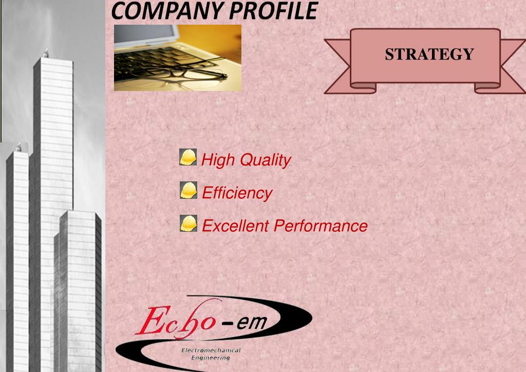 BACKGROUND “Echo for Electromechanical Engineering" was established in1992 as a Consulting Engineering office in Amman - Jordan. ECHO is an established and well reputed Consulting Engineering Office in consulting firm at the Jordan Engineers Association (JEA). Registration number 1330.