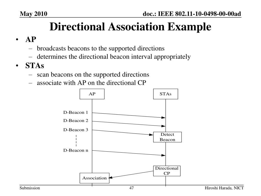 Directional Association Example • AP • broadcasts beacons to the supported directions • determines the directional beacon interval appropriately • STAs • scan beacons on the supported directions • associate with AP on the directional CP Hiroshi Harada, NICT