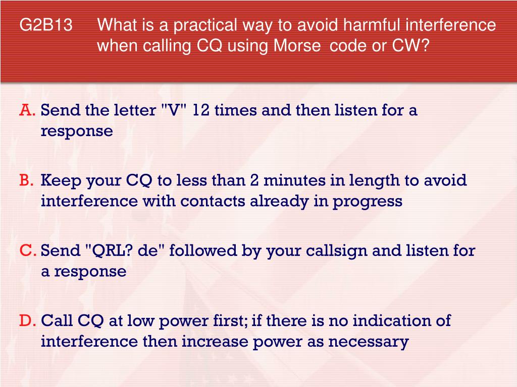 G2…Operating ProceduresG2B • Operating courtesy(cont) • A practical way to avoid harmful interference when selecting a frequency to call CQ using phone is to ask if the frequency is in use, say your callsign, and listen for a response. • A practical way to avoid harmful interference when calling CQ using Morse code or CW is by sending "QRL? de" followed by your callsign and listen for a response.