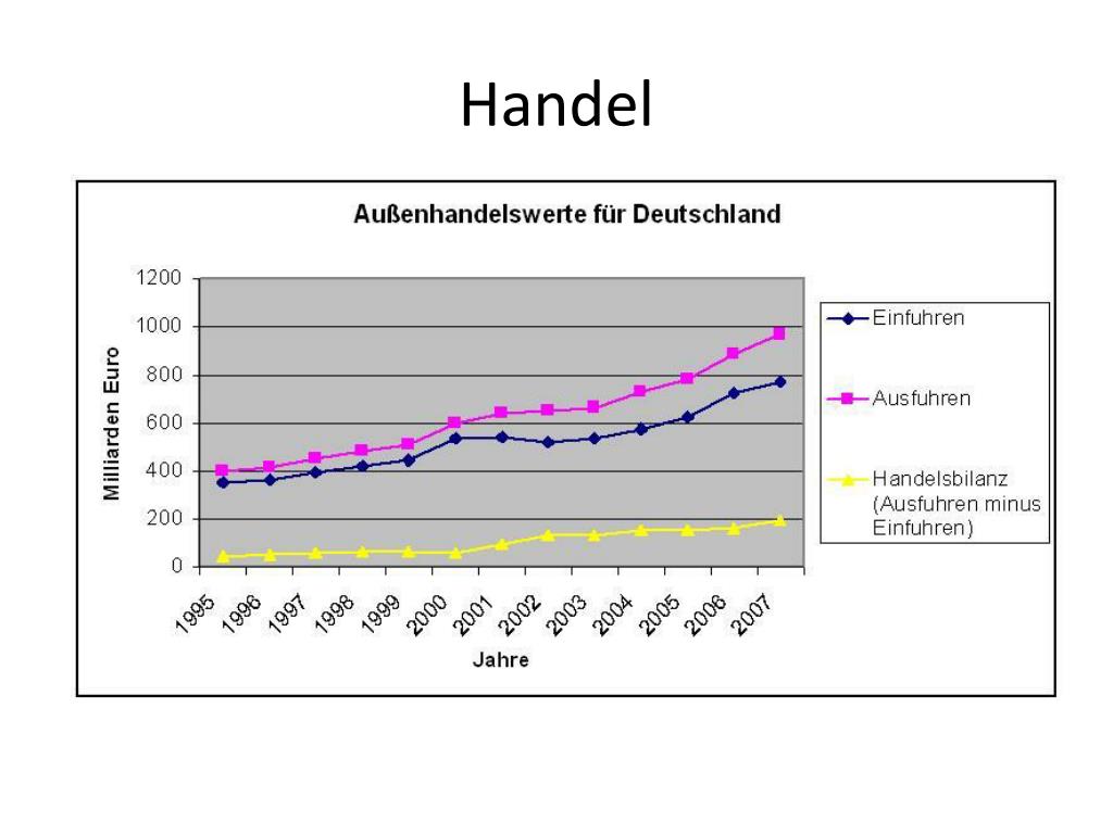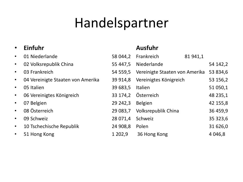 Handelspartner • Einfuhr Ausfuhr • 01 Niederlande 58 044,2 Frankreich 81 941,1 • 02 Volksrepublik China 55 447,5 Niederlande 54 142,2 • 03 Frankreich 54 559,5 Vereinigte Staaten von Amerika 53 834,6 • 04 Vereinigte Staaten von Amerika 39 914,8 Vereinigtes Königreich 53 156,2 • 05 Italien 39 683,5 Italien 51 050,1 • 06 Vereinigtes Königreich 33 174,2 Österreich 48 235,1 • 07 Belgien 29 242,3 Belgien 42 155,8 • 08 Österreich 29 083,7 Volksrepublik China 36 459,9 • 09 Schweiz 28 071,4 Schweiz 35 323,6 • 10 Tschechische Republik 24 908,8 Polen 31 626,0 • 51 Hong Kong 1 202,9 36 Hong Kong 4 046,8