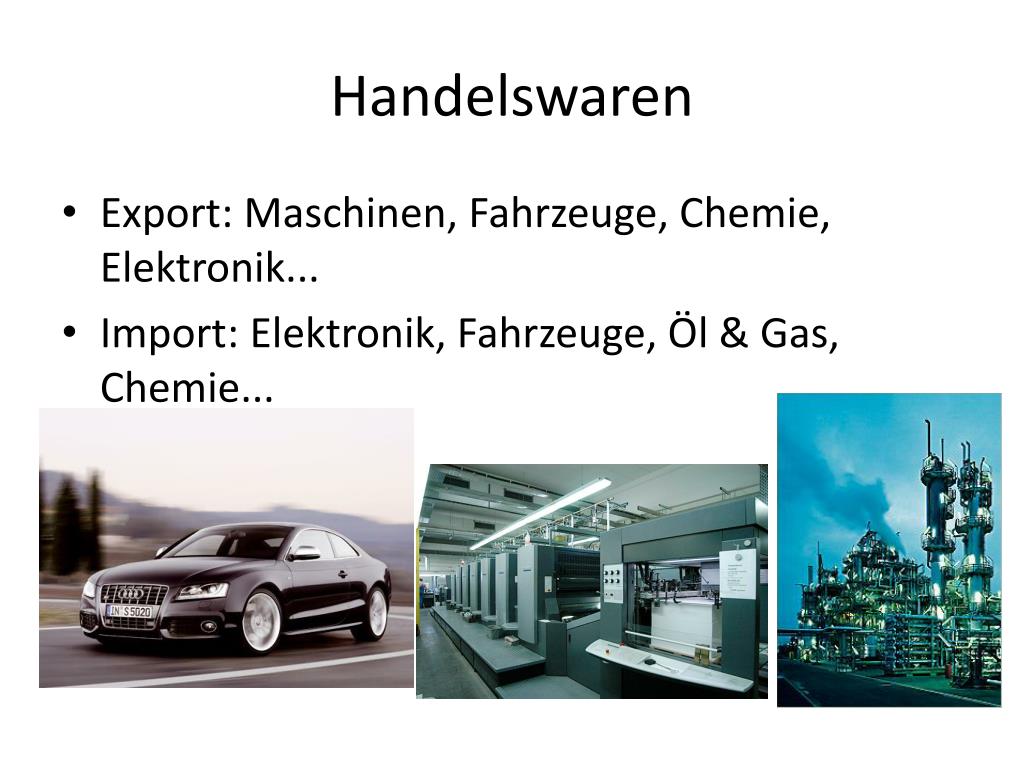 Handelswaren • Export: Maschinen, Fahrzeuge, Chemie, Elektronik... • Import: Elektronik, Fahrzeuge, Öl & Gas, Chemie...
