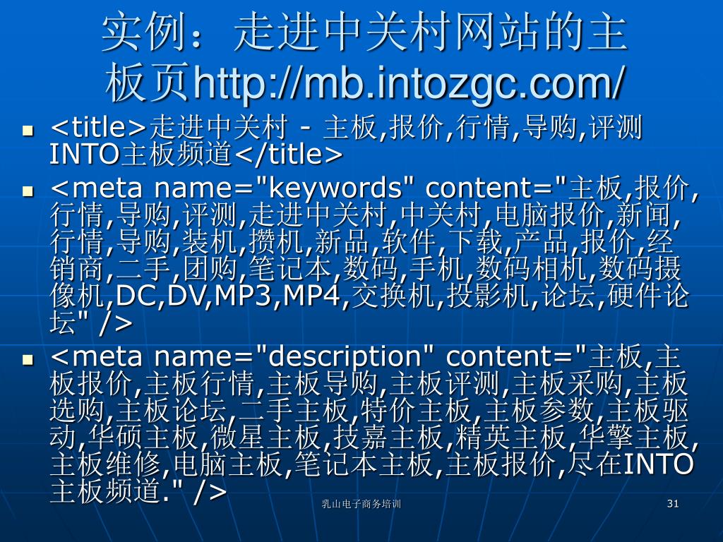实例:走进中关村网站的主板页http://mb.intozgc.com/实例:走进中关村网站的主板页http://mb.intozgc.com/ • <title>走进中关村 - 主板,报价,行情,导购,评测 INTO主板频道</title> • <meta name="keywords" content="主板,报价,行情,导购,评测,走进中关村,中关村,电脑报价,新闻,行情,导购,装机,攒机,新品,软件,下载,产品,报价,经销商,二手,团购,笔记本,数码,手机,数码相机,数码摄像机,DC,DV,MP3,MP4,交换机,投影机,论坛,硬件论坛" /> • <meta name="description" content="主板,主板报价,主板行情,主板导购,主板评测,主板采购,主板选购,主板论坛,二手主板,特价主板,主板参数,主板驱动,华硕主板,微星主板,技嘉主板,精英主板,华擎主板,主板维修,电脑主板,笔记本主板,主板报价,尽在INTO主板频道." /> 乳山电子商务培训