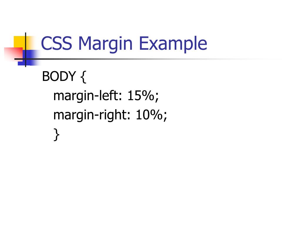 CSS Margin Example BODY { margin-left: 15%; margin-right: 10%; }