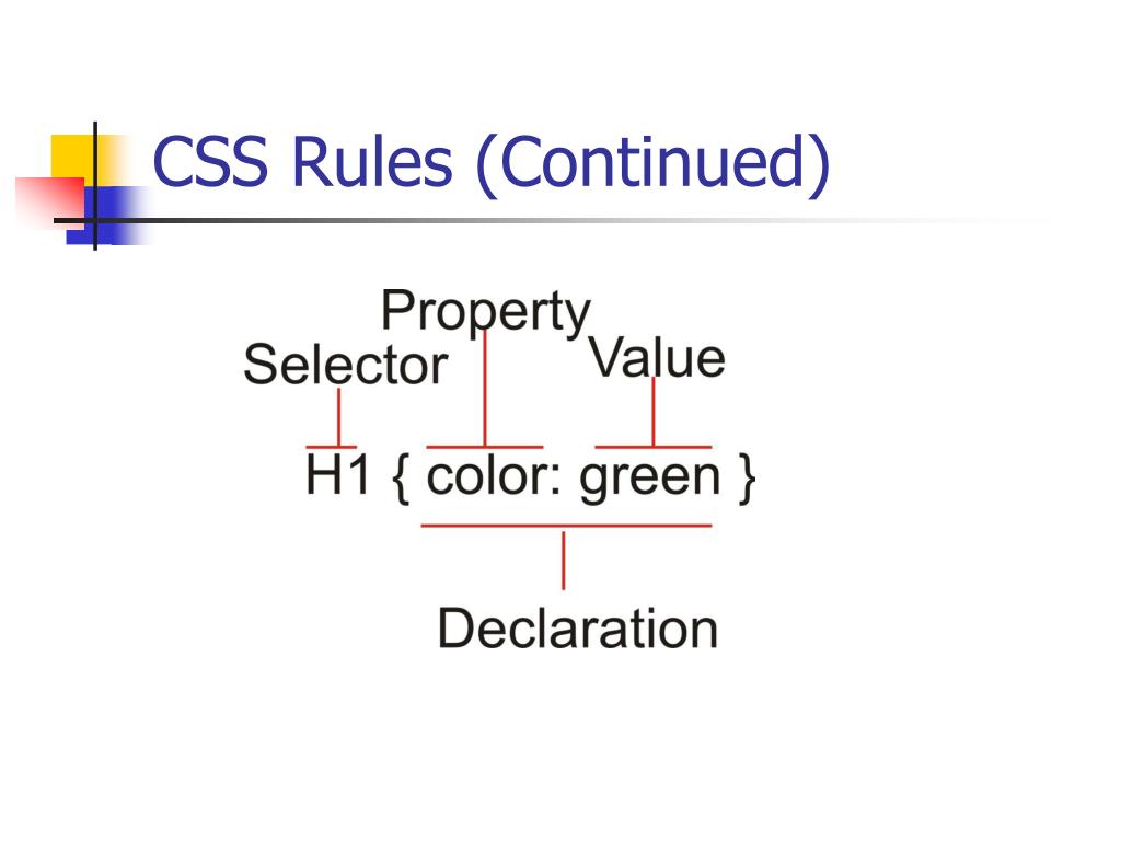 CSS Rules (Continued) • A declaration has two (2) parts separated by a colon.1. Property: The part before the colon2. Value: The part after the colon