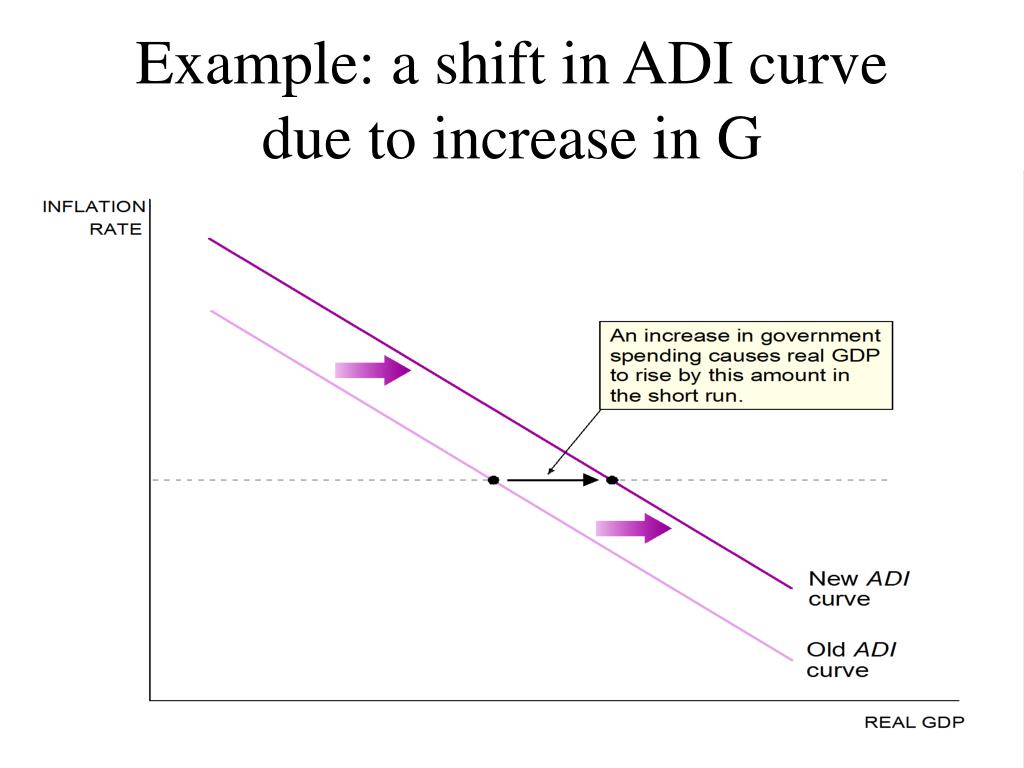 Movements along the ADI curve: when changes in the inflation rate cause real GDP to change Shifts of the ADI curve: when changes in anything else cause real GDP to change change in government purchases change in net exports (Asian financial crisis) change in monetary policy rule Shifts versus movements along the ADI curve