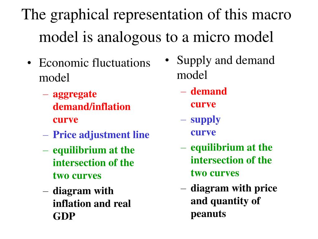 Economic fluctuations model aggregate demand/inflation curve Price adjustment line equilibrium at the intersection of the two curves diagram with inflation and real GDP Supply and demand model demand curve supply curve equilibrium at the intersection of the two curves diagram with price and quantity of peanuts The graphical representation of this macro model is analogous to a micro model