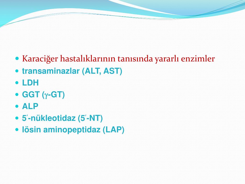 Karaciğer hastalıklarının tanısında yararlı enzimler • transaminazlar (ALT, AST) • LDH • GGT (-GT) • ALP • 5-nükleotidaz (5-NT) • lösinaminopeptidaz (LAP)