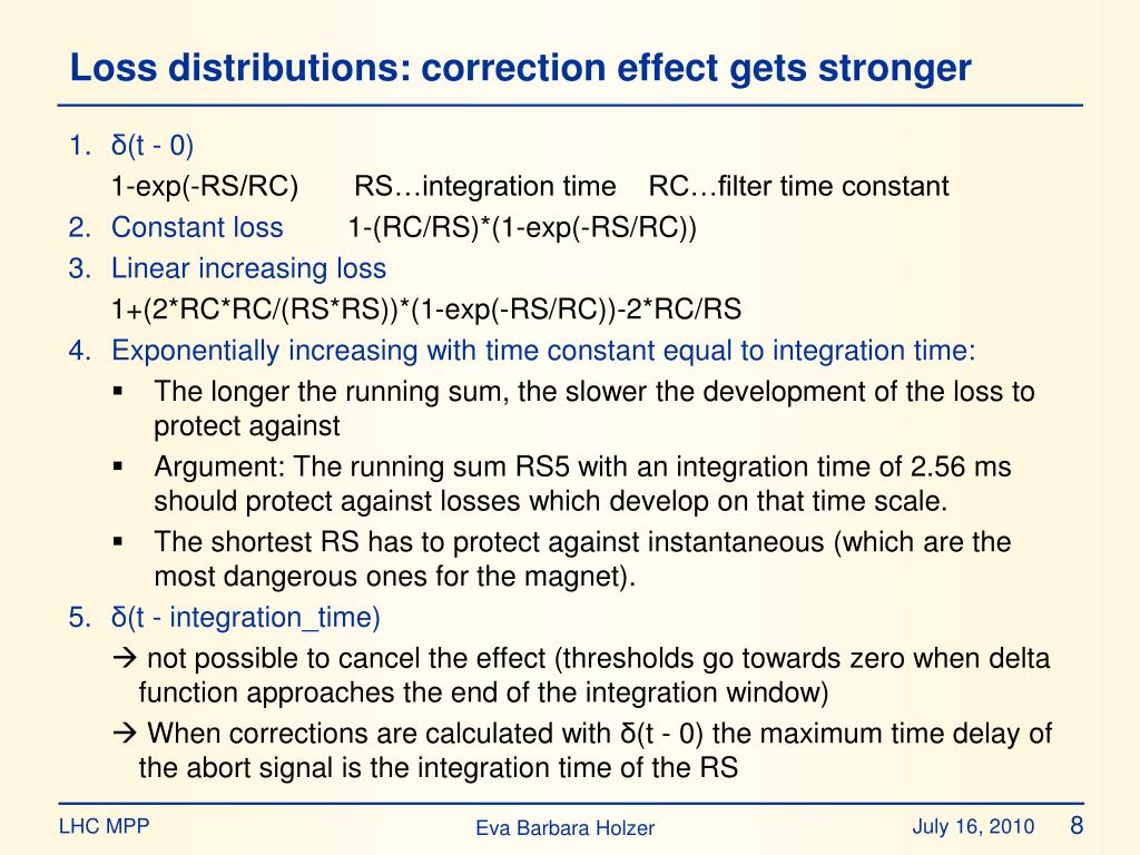 Loss distributions: correction effect gets stronger • δ(t - 0) 1-exp(-RS/RC) RS…integration time RC…filter time constant • Constant loss 1-(RC/RS)*(1-exp(-RS/RC)) • Linear increasing loss 1+(2*RC*RC/(RS*RS))*(1-exp(-RS/RC))-2*RC/RS • Exponentially increasing with time constant equal to integration time: • The longer the running sum, the slower the development of the loss to protect against • Argument: The running sum RS5 with an integration time of 2.56 ms should protect against losses which develop on that time scale. • The shortest RS has to protect against instantaneous (which are the most dangerous ones for the magnet). • δ(t - integration_time) • not possible to cancel the effect (thresholds go towards zero when delta function approaches the end of the integration window) • When corrections are calculated with δ(t - 0) the maximum time delay of the abort signal is the integration time of the RS