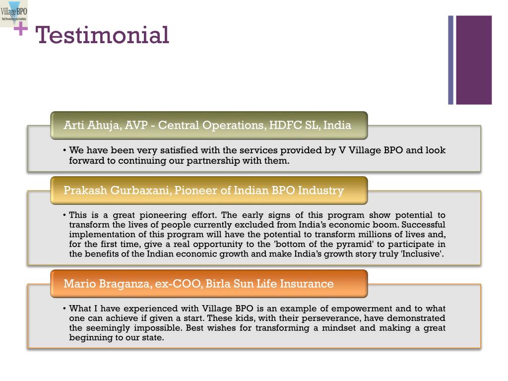 Why Village BPO? Flexible Delivery Model • Scanning at the Locations or at Bangalore, Indexing and Data Creation at the VVBPO Service centers in the villages • Scanning at the Client Location and Indexing and Meta Creation at Service centers in the villages • Using Images already created by Client’s Scanning Centers and Data Creation at Service centers in the villages Flexible Pricing Model • All inclusive Per Page or per application or per FTE Cost • Cost broken down into Individual Components Past Experience • Huge experience in choreographing workflow Solutions, developed in-house framework solutions for clients, with different complexities Independent and Complete Set-up • Scanning Onsite or at Metros in India • Workflow and Document Management Offshore Complete Integration • Ability to take Data Feeds from most of the system and extract Data for Uploading to Other Systems • Easy Integration to any Client System Infrastructure • Secured & reliable Environment • Scalable Architecture • 24X7 Offshore Support Team