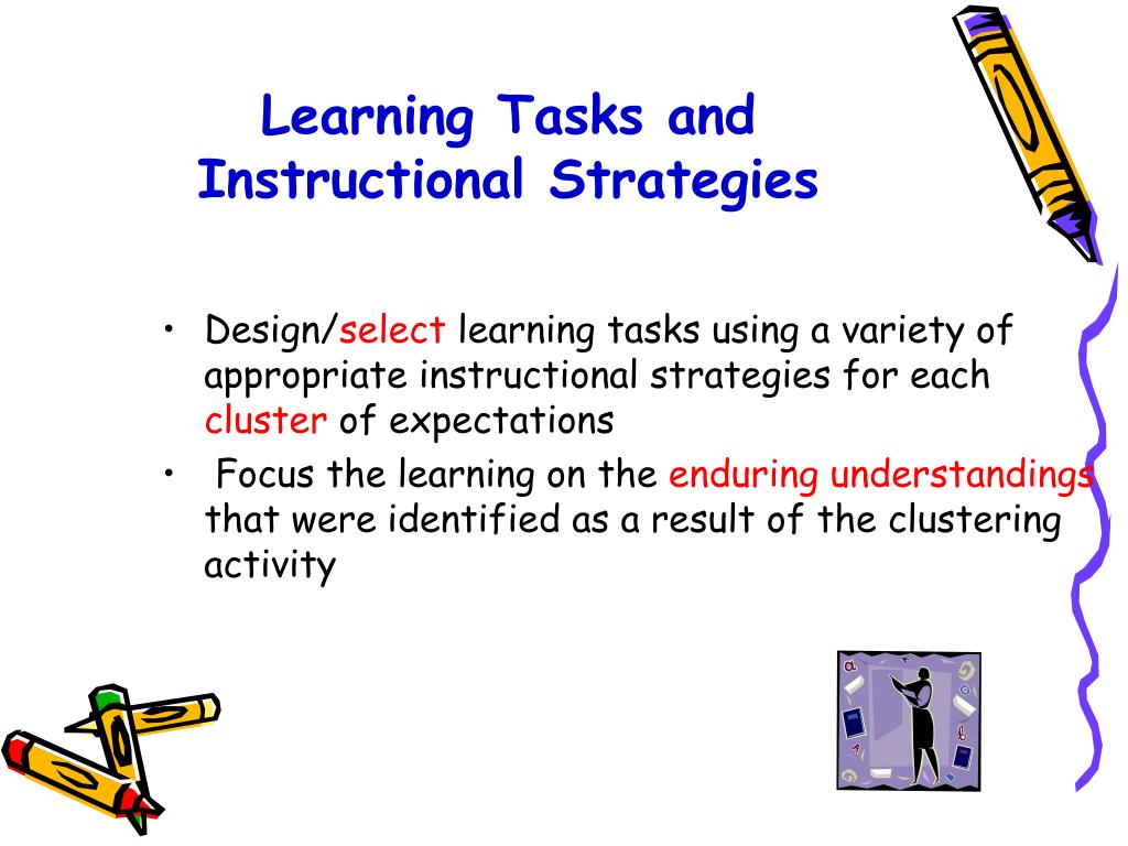 Learning Tasks and Instructional Strategies • Design/select learning tasks using a variety of appropriate instructional strategies for each cluster of expectations • Focus the learning on the enduringunderstandings that were identified as a result of the clustering activity