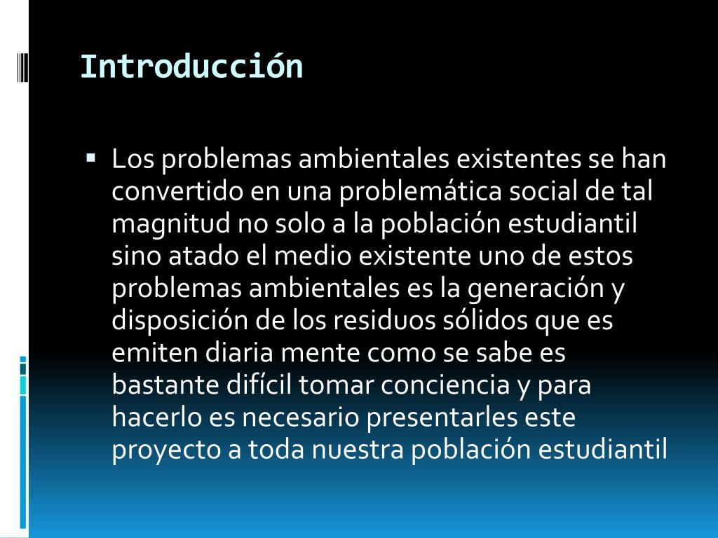 Introducción • Los problemas ambientales existentes se han convertido en una problemática social de tal magnitud no solo a la población estudiantil sino atado el medio existente uno de estos problemas ambientales es la generación y disposición de los residuos sólidos que es emiten diaria mente como se sabe es bastante difícil tomar conciencia y para hacerlo es necesario presentarles este proyecto a toda nuestra población estudiantil