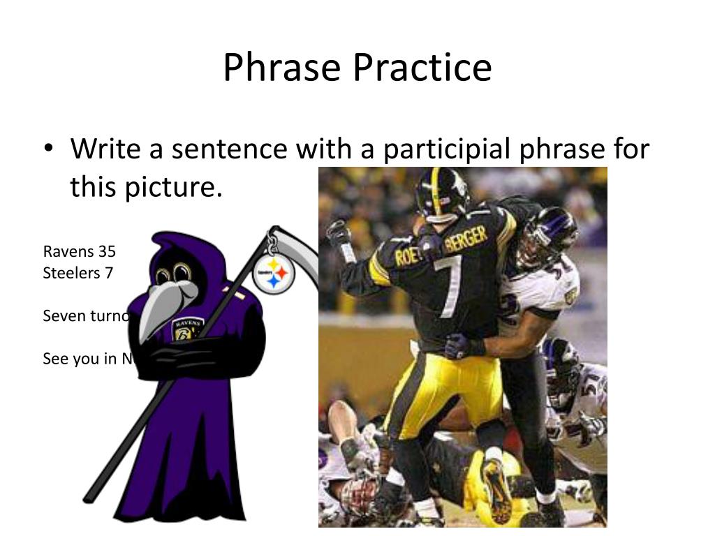 Phrase Practice • Write a sentence with a participial phrase for this picture. Ravens 35 Steelers 7 Seven turnovers See you in November.