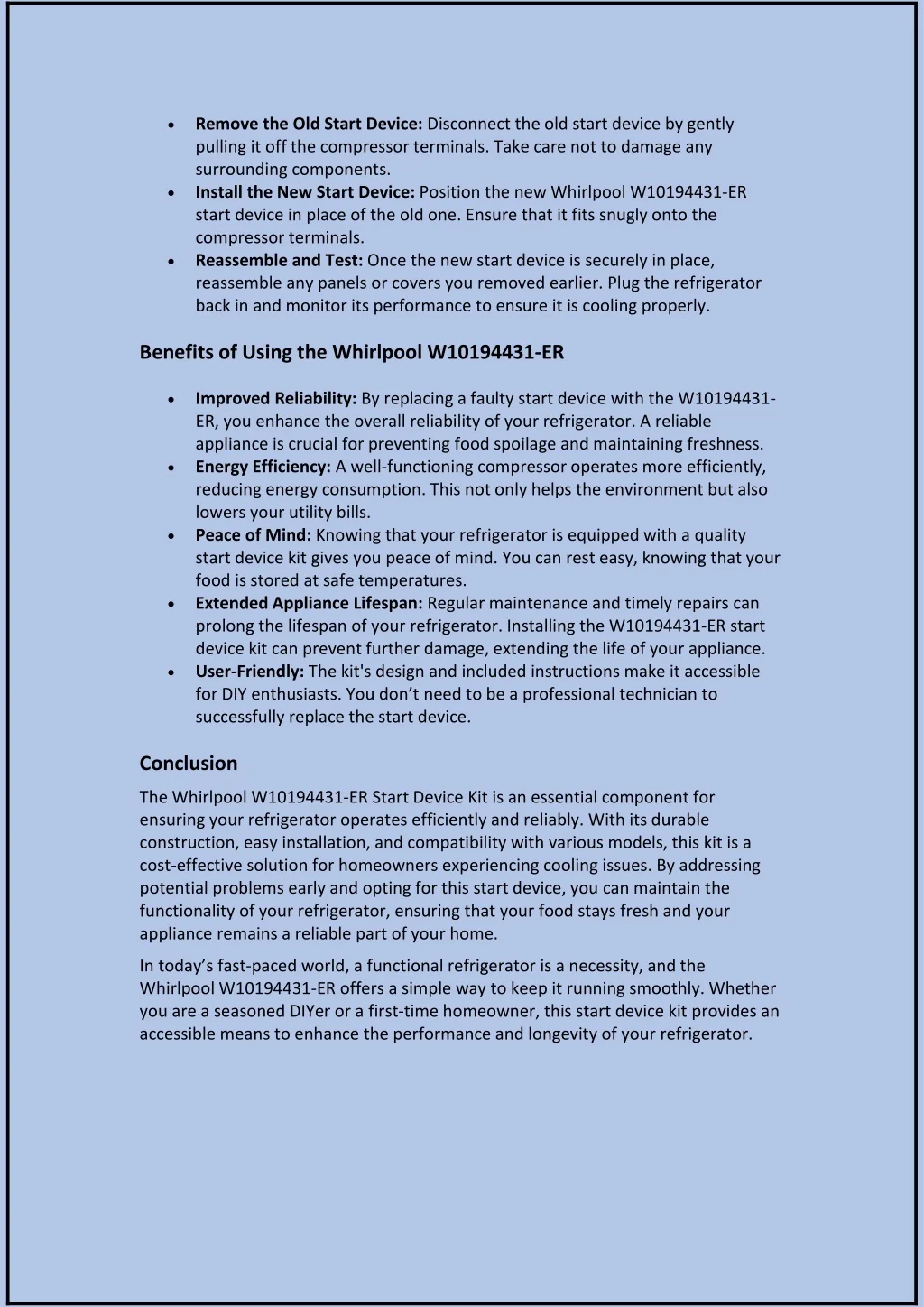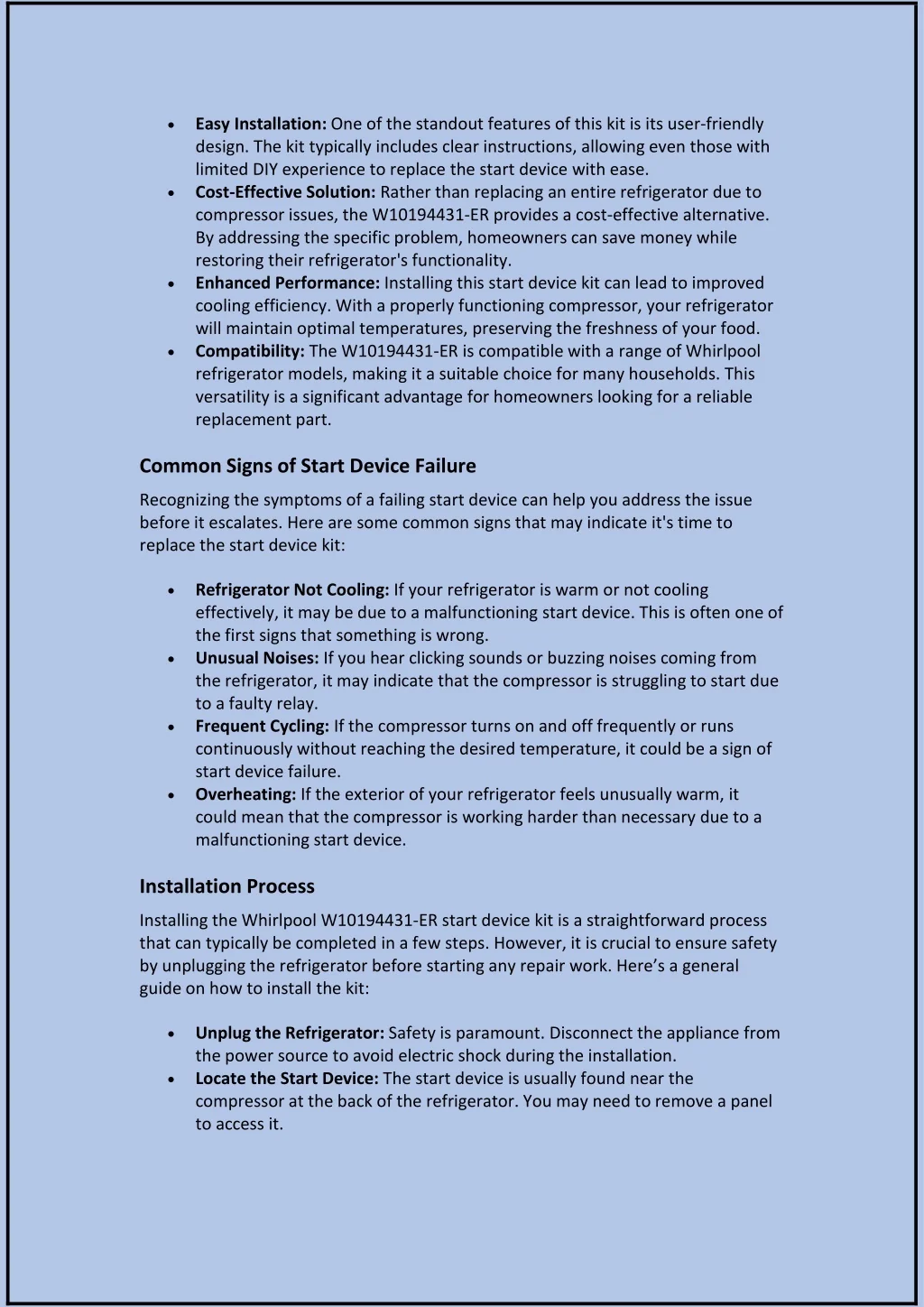 Easy Installation: One of the standout features of this kit is its user-friendly design. The kit typically includes clear instructions, allowing even those with limited DIY experience to replace the start device with ease. Cost-Effective Solution: Rather than replacing an entire refrigerator due to compressor issues, the W10194431-ER provides a cost-effective alternative. By addressing the specific problem, homeowners can save money while restoring their refrigerator's functionality. Enhanced Performance: Installing this start device kit can lead to improved cooling efficiency. With a properly functioning compressor, your refrigerator will maintain optimal temperatures, preserving the freshness of your food. Compatibility: The W10194431-ER is compatible with a range of Whirlpool refrigerator models, making it a suitable choice for many households. This versatility is a significant advantage for homeowners looking for a reliable replacement part. Common Signs of Start Device Failure Recognizing the symptoms of a failing start device can help you address the issue before it escalates. Here are some common signs that may indicate it's time to replace the start device kit: Refrigerator Not Cooling: If your refrigerator is warm or not cooling effectively, it may be due to a malfunctioning start device. This is often one of the first signs that something is wrong. Unusual Noises: If you hear clicking sounds or buzzing noises coming from the refrigerator, it may indicate that the compressor is struggling to start due to a faulty relay. Frequent Cycling: If the compressor turns on and off frequently or runs continuously without reaching the desired temperature, it could be a sign of start device failure. Overheating: If the exterior of your refrigerator feels unusually warm, it could mean that the compressor is working harder than necessary due to a malfunctioning start device. Installation Process Installing the Whirlpool W10194431-ER start device kit is a straightforward process that can typically be completed in a few steps. However, it is crucial to ensure safety by unplugging the refrigerator before starting any repair work. Here’s a general guide on how to install the kit: Unplug the Refrigerator: Safety is paramount. Disconnect the appliance from the power source to avoid electric shock during the installation. Locate the Start Device: The start device is usually found near the compressor at the back of the refrigerator. You may need to remove a panel to access it.