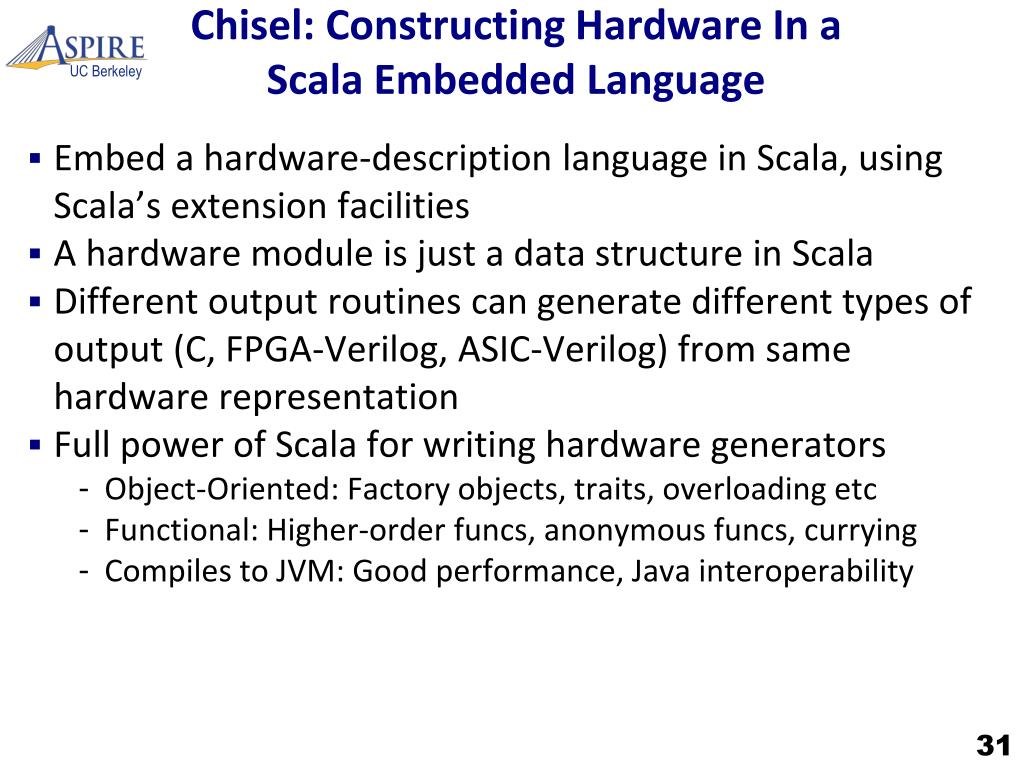 Chisel: Constructing Hardware In a Scala Embedded Language • Embed a hardware-description language in Scala, using Scala’s extension facilities • A hardware module is just a data structure in Scala • Different output routines can generate different types of output (C, FPGA-Verilog, ASIC-Verilog) from same hardware representation • Full power of Scala for writing hardware generators • Object-Oriented: Factory objects, traits, overloading etc • Functional: Higher-order funcs, anonymous funcs, currying • Compiles to JVM: Good performance, Java interoperability