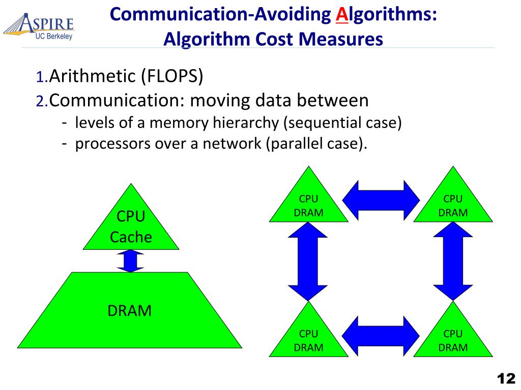 Communication-Avoiding Algorithms: Algorithm Cost Measures CPU Cache CPU DRAM CPU DRAM DRAM CPU DRAM CPU DRAM • Arithmetic (FLOPS) • Communication: moving data between • levels of a memory hierarchy (sequential case) • processors over a network (parallel case).