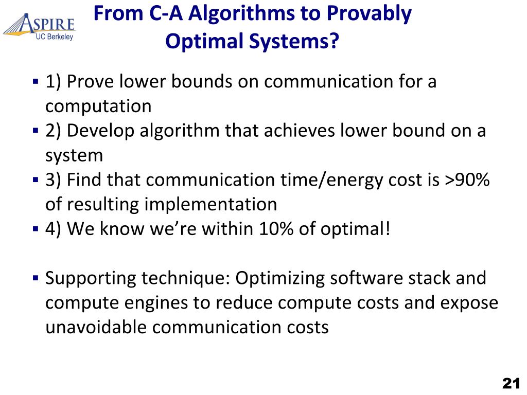 From C-A Algorithms to Provably Optimal Systems? • 1) Prove lower bounds on communication for a computation • 2) Develop algorithm that achieves lower bound on a system • 3) Find that communication time/energy cost is >90% of resulting implementation • 4) We know we’re within 10% of optimal! • Supporting technique: Optimizing software stack and compute engines to reduce compute costs and expose unavoidable communication costs