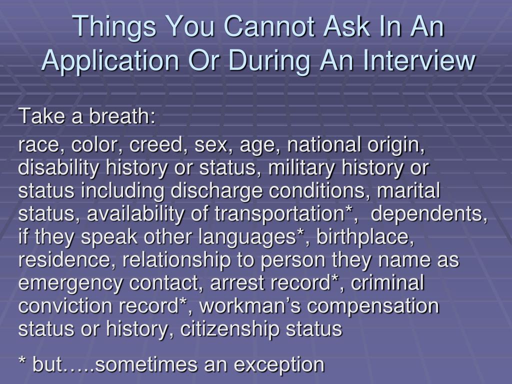 Things You Cannot Ask In An Application Or During An Interview Take a breath: race, color, creed, sex, age, national origin, disability history or status, military history or status including discharge conditions, marital status, availability of transportation*, dependents, if they speak other languages*, birthplace, residence, relationship to person they name as emergency contact, arrest record*, criminal conviction record*, workman’s compensation status or history, citizenship status * but…..sometimes an exception