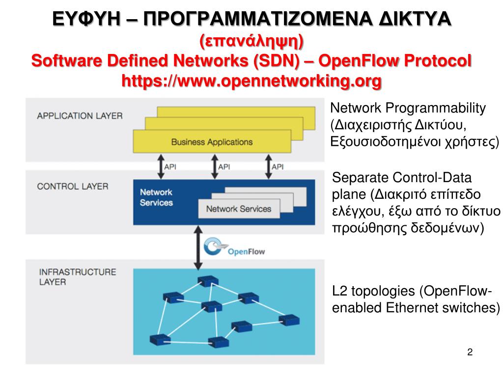 ΕΥΦΥΗ – ΠΡΟΓΡΑΜΜΑΤΙΖΟΜΕΝΑ ΔΙΚΤΥΑ(επανάληψη)Software Defined Networks (SDN) – OpenFlow Protocolhttps://www.opennetworking.org Network Programmability (Διαχειριστής Δικτύου, Εξουσιοδοτημένοι χρήστες) Separate Control-Data plane (Διακριτό επίπεδο ελέγχου, έξω από το δίκτυο προώθησης δεδομένων) L2 topologies (OpenFlow-enabled Ethernet switches)