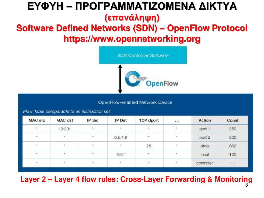 ΕΥΦΥΗ – ΠΡΟΓΡΑΜΜΑΤΙΖΟΜΕΝΑ ΔΙΚΤΥΑ(επανάληψη)Software Defined Networks (SDN) – OpenFlow Protocolhttps://www.opennetworking.org Layer 2 – Layer 4 flow rules: Cross-Layer Forwarding & Monitoring