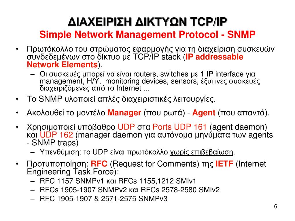 ΔΙΑΧΕΙΡΙΣΗ ΔΙΚΤΥΩΝ TCP/IPSimple Network Management Protocol - SNMP • Πρωτόκολλο του στρώματος εφαρμογής για τη διαχείριση συσκευών συνδεδεμένων στο δίκτυο με TCP/IP stack (IP addressable Network Elements). • Οι συσκευές μπορεί να είναι routers, switches με 1 IP interface για management, Η/Υ, monitoring devices, sensors, έξυπνες συσκευές διαχειριζόμενες από το Internet ... • Το SNMP υλοποιεί απλές διαχειριστικές λειτουργίες. • Ακολουθεί το μοντέλο Manager (που ρωτά) - Agent(που απαντά). • Χρησιμοποιεί υπόβαθρο UDP στα Ports UDP 161 (agent daemon) καιUDP162 (manager daemon για αυτόνομα μηνύματα των agents -SNMPtraps) • Υπενθύμιση: το UDP είναι πρωτόκολλο χωρίς επιβεβαίωση. • Προτυποποίηση: RFC (Request for Comments) της IETF (Internet Engineering Task Force): • RFC 1157 SNMPv1 και RFCs 1155,1212 SMIv1 • RFCs 1905-1907 SNMPv2 και RFCs 2578-2580 SMIv2 • RFC 1905-1907 & 2571-2575 SNMPv3
