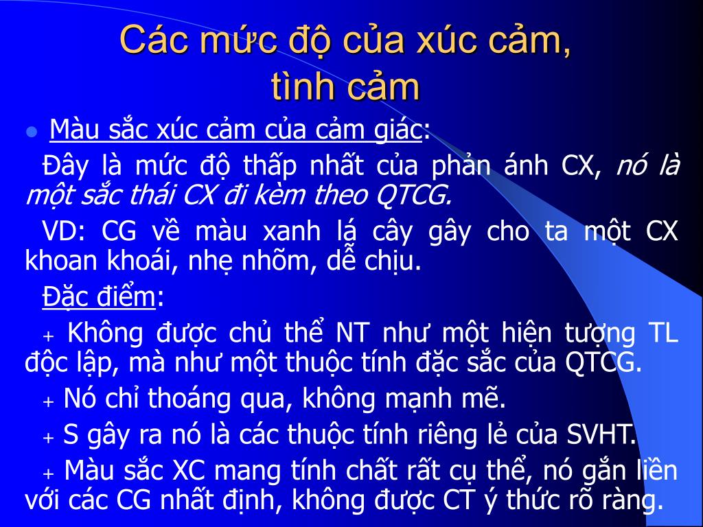 Các mức độ của xúc cảm, tình cảm • Màu sắc xúc cảm của cảm giác: Đây là mức độ thấp nhất của phản ánh CX, nó là một sắc thái CX đi kèm theo QTCG. VD: CG về màu xanh lá cây gây cho ta một CX khoan khoái, nhẹ nhõm, dễ chịu. Đặc điểm: + Không được chủ thể NT như một hiện tượng TL độc lập, mà như một thuộc tính đặc sắc của QTCG. + Nó chỉ thoáng qua, không mạnh mẽ. + S gây ra nó là các thuộc tính riêng lẻ của SVHT. + Màu sắc XC mang tính chất rất cụ thể, nó gắn liền với các CG nhất định, không được CT ý thức rõ ràng.