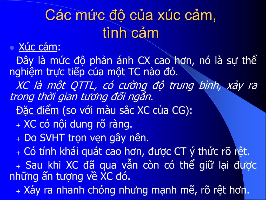 Các mức độ của xúc cảm, tình cảm • Xúc cảm: Đây là mức độ phản ánh CX cao hơn, nó là sự thể nghiệm trực tiếp của một TC nào đó. XC là một QTTL, có cường độ trung bình, xảy ra trong thời gian tương đối ngắn. Đặc điểm (so với màu sắc XC của CG): + XC có nội dung rõ ràng. + Do SVHT trọn vẹn gây nên. + Có tính khái quát cao hơn, được CT ý thức rõ rệt. + Sau khi XC đã qua vẫn còn có thể giữ lại được những ấn tượng về XC đó. + Xảy ra nhanh chóng nhưng mạnh mẽ, rõ rệt hơn.