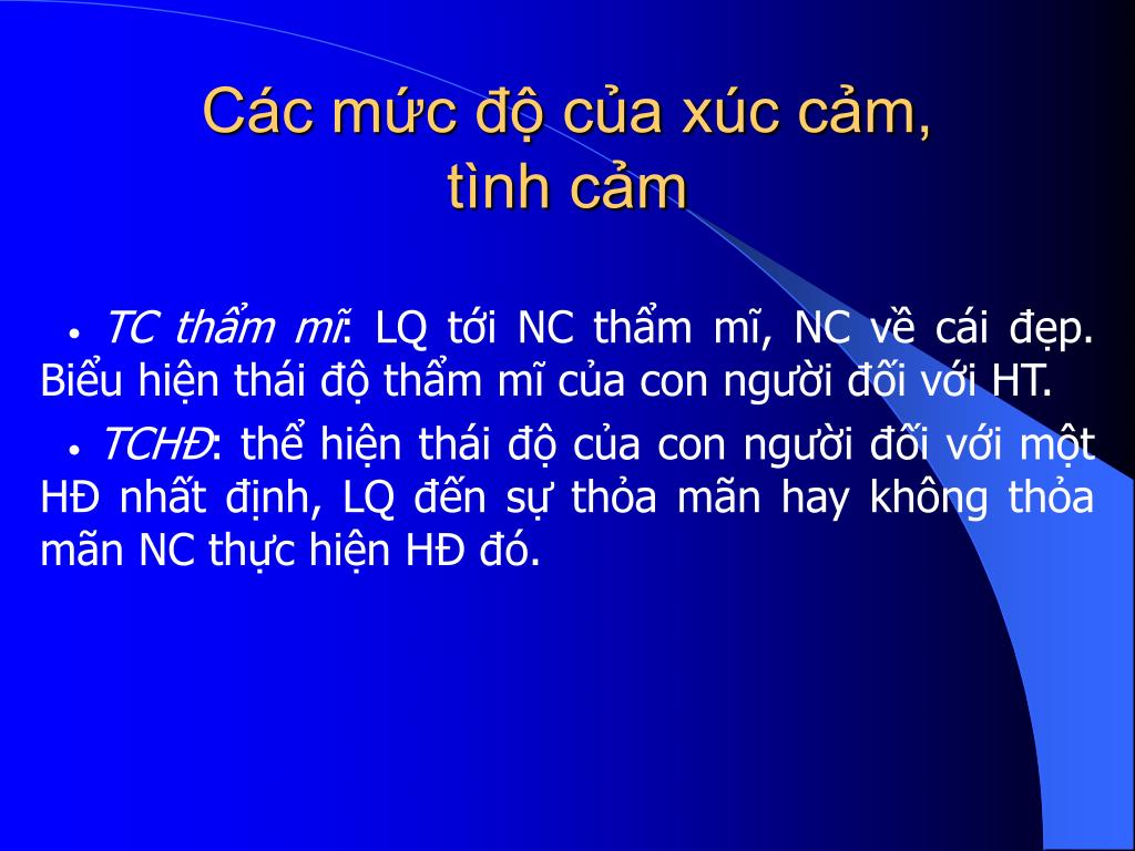 Các mức độ của xúc cảm, tình cảm •TC thẩm mĩ: LQ tới NC thẩm mĩ, NC về cái đẹp. Biểu hiện thái độ thẩm mĩ của con người đối với HT. •TCHĐ: thể hiện thái độ của con người đối với một HĐ nhất định, LQ đến sự thỏa mãn hay không thỏa mãn NC thực hiện HĐ đó.