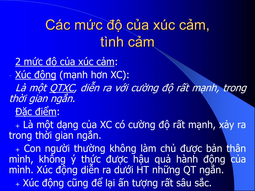 Các mức độ của xúc cảm, tình cảm 2 mức độ của xúc cảm: • Xúc động (mạnh hơn XC): Là một QTXC, diễn ra với cường độ rất mạnh, trong thời gian ngắn. Đặc điểm: + Là một dạng của XC có cường độ rất mạnh, xảy ra trong thời gian ngắn. + Con người thường không làm chủ được bản thân mình, không ý thức được hậu quả hành động của mình. Xúc động diễn ra dưới HT những QT ngắn. + Xúc động cũng để lại ấn tượng rất sâu sắc.
