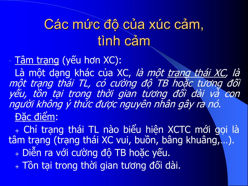Các mức độ của xúc cảm, tình cảm • Tâm trạng (yếu hơn XC): Là một dạng khác của XC, là một trạng thái XC, là một trạng thái TL, có cường độ TB hoặc tương đối yếu, tồn tại trong thời gian tương đối dài và con người không ý thức được nguyên nhân gây ra nó. Đặc điểm: + Chỉ trạng thái TL nào biểu hiện XCTC mới gọi là tâm trạng (trạng thái XC vui, buồn, bâng khuâng,…). + Diễn ra với cường độ TB hoặc yếu. + Tồn tại trong thời gian tương đối dài.