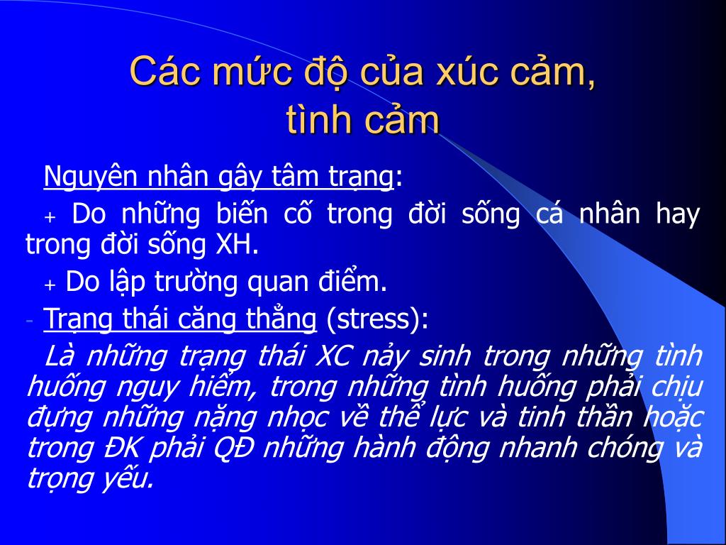 Các mức độ của xúc cảm, tình cảm Nguyên nhân gây tâm trạng: + Do những biến cố trong đời sống cá nhân hay trong đời sống XH. + Do lập trường quan điểm. • Trạng thái căng thẳng (stress): Là những trạng thái XC nảy sinh trong những tình huống nguy hiểm, trong những tình huống phải chịu đựng những nặng nhọc về thể lực và tinh thần hoặc trong ĐK phải QĐ những hành động nhanh chóng và trọng yếu.