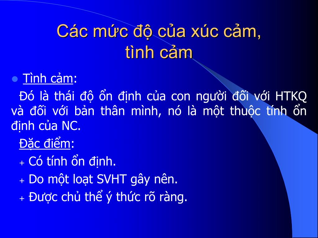 Các mức độ của xúc cảm, tình cảm • Tình cảm: Đó là thái độ ổn định của con người đối với HTKQ và đối với bản thân mình, nó là một thuộc tính ổn định của NC. Đặc điểm: + Có tính ổn định. + Do một loạt SVHT gây nên. + Được chủ thể ý thức rõ ràng.