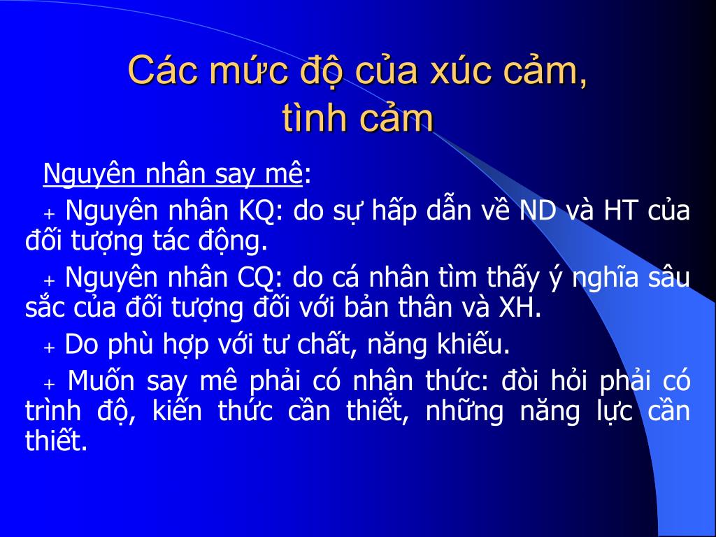 Các mức độ của xúc cảm, tình cảm Nguyên nhân say mê: + Nguyên nhân KQ: do sự hấp dẫn về ND và HT của đối tượng tác động. + Nguyên nhân CQ: do cá nhân tìm thấy ý nghĩa sâu sắc của đối tượng đối với bản thân và XH. + Do phù hợp với tư chất, năng khiếu. + Muốn say mê phải có nhận thức: đòi hỏi phải có trình độ, kiến thức cần thiết, những năng lực cần thiết.
