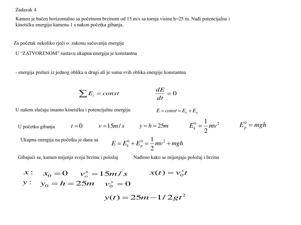 U našem slučaju imamo kinetičku i potencijalnu energiju U početku gibanja Za početak nekoliko rječi ozakonu sačuvanja energije U “ZATVORENOM” sustavu ukupna energija je konstantna - energija prelazi iz jednog oblika u drugi ali je suma svih oblika energije konstantna Ukupna energija na početku je dana sa Zadazak 4 Kamen je bačen horizontalno sa početnom brzinom od 15 m/s sa tornja visine h=25 m. Nađi potencijalnu i kinetičku energiju kamena 1 s nakon početka gibanja. Gibajući se, kamen mijenja svoju brzinu i položaj Nađimo kako se mijenjaju položaj i brzina