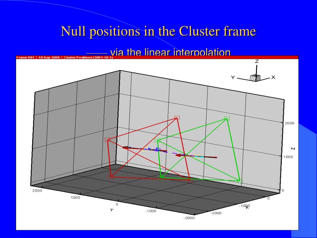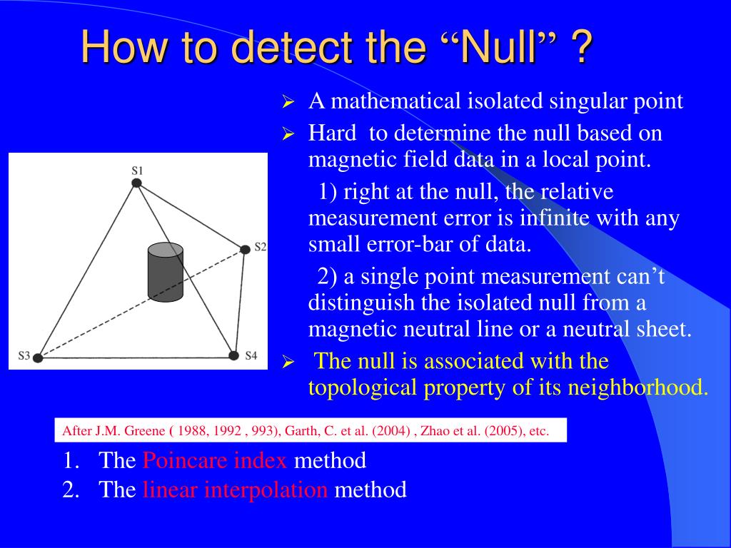 How to detect the “Null” ? • A mathematical isolated singular point • Hard to determine the null based on magnetic field data in a local point. 1) right at the null, the relative measurement error is infinite with any small error-bar of data. 2) a single point measurement can’t distinguish the isolated null from a magnetic neutral line or a neutral sheet. • The null is associated with the topological property of its neighborhood. After J.M. Greene ( 1988, 1992 , 993), Garth, C. et al. (2004) , Zhao et al. (2005), etc. • The Poincare index method • The linear interpolation method