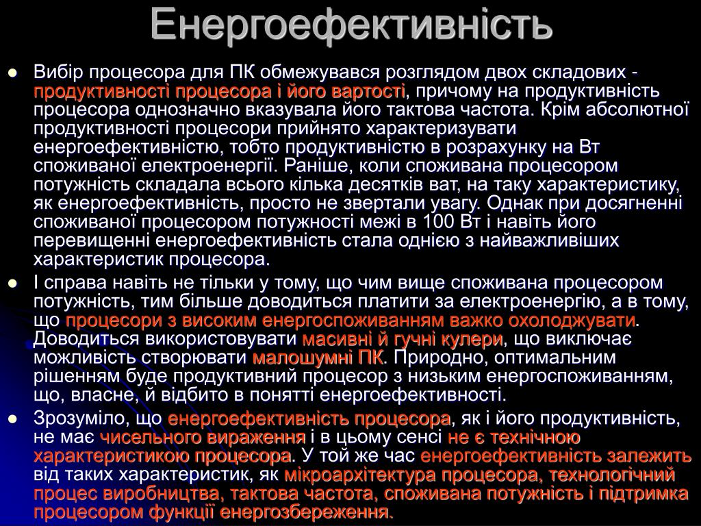Енергоефективність • Вибір процесора для ПК обмежувався розглядом двох складових - продуктивності процесора і його вартості, причому на продуктивність процесора однозначно вказувала його тактова частота. Крім абсолютної продуктивності процесори прийнято характеризувати енергоефективністю, тобто продуктивністю в розрахунку на Вт споживаної електроенергії. Раніше, коли споживана процесором потужність складала всього кілька десятків ват, на таку характеристику, як енергоефективність, просто не звертали увагу. Однак при досягненні споживаної процесором потужності межі в 100 Вт і навіть його перевищенні енергоефективність стала однією з найважливіших характеристик процесора. • І справа навіть не тільки у тому, що чим вище споживана процесором потужність, тим більше доводиться платити за електроенергію, а в тому, що процесори з високим енергоспоживанням важко охолоджувати. Доводиться використовувати масивні й гучні кулери, що виключає можливість створювати малошумні ПК. Природно, оптимальним рішенням буде продуктивний процесор з низьким енергоспоживанням, що, власне, й відбито в понятті енергоефективності. • Зрозуміло, що енергоефективність процесора, як і його продуктивність, не має чисельного вираження і в цьому сенсі не є технічною характеристикою процесора. У той же час енергоефективністьзалежить від таких характеристик, як мікроархітектура процесора, технологічний процес виробництва, тактова частота, споживана потужність і підтримка процесором функції енергозбереження.