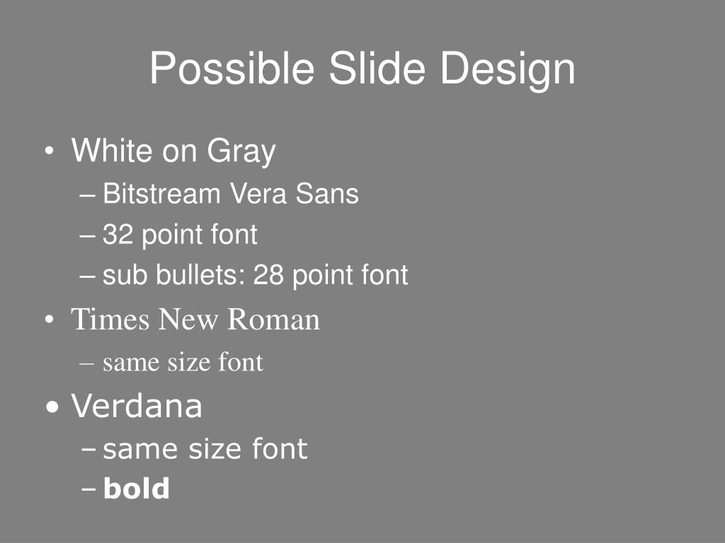 Possible Slide Design • White on Gray • Bitstream Vera Sans • 32 point font • sub bullets: 28 point font • Times New Roman • same size font • Verdana • same size font • bold