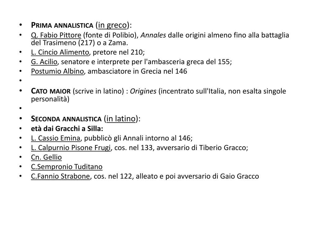 Prima annalistica(in greco): • Q. Fabio Pittore (fonte di Polibio), Annales dalle origini almeno fino alla battaglia del Trasimeno (217) o a Zama. • L. Cincio Alimento, pretore nel 210; • G. Acilio, senatore e interprete per l'ambasceria greca del 155; • Postumio Albino, ambasciatore in Grecia nel 146 • Catomaior(scrive in latino) : Origines (incentrato sull'Italia, non esalta singole personalità) • Seconda annalistica(in latino): • età dai Gracchi a Silla: • L. CassioEmina, pubblicò gli Annali intorno al 146; • L. CalpurnioPisoneFrugi, cos. nel 133, avversario di Tiberio Gracco; • Cn. Gellio • C.SempronioTuditano • C.FannioStrabone, cos. nel 122, alleato e poi avversario di Gaio Gracco