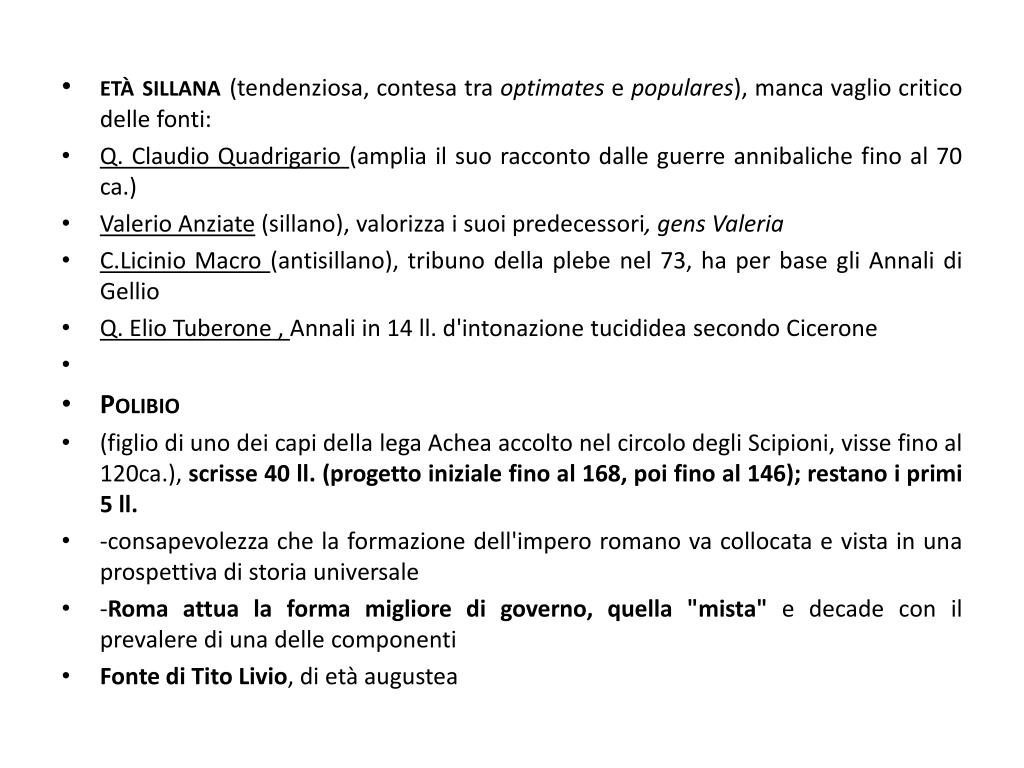 età sillana(tendenziosa, contesa tra optimates e populares), manca vaglio critico delle fonti: • Q. Claudio Quadrigario (amplia il suo racconto dalle guerre annibaliche fino al 70 ca.) • Valerio Anziate (sillano), valorizza i suoi predecessori, gens Valeria • C.Licinio Macro (antisillano), tribuno della plebe nel 73, ha per base gli Annali di Gellio • Q. Elio Tuberone , Annali in 14 ll. d'intonazione tucididea secondo Cicerone • Polibio • (figlio di uno dei capi della lega Achea accolto nel circolo degli Scipioni, visse fino al 120ca.), scrisse 40 ll. (progetto iniziale fino al 168, poi fino al 146); restano i primi 5 ll. • -consapevolezza che la formazione dell'impero romano va collocata e vista in una prospettiva di storia universale • -Roma attua la forma migliore di governo, quella "mista" e decade con il prevalere di una delle componenti • Fonte di Tito Livio, di età augustea