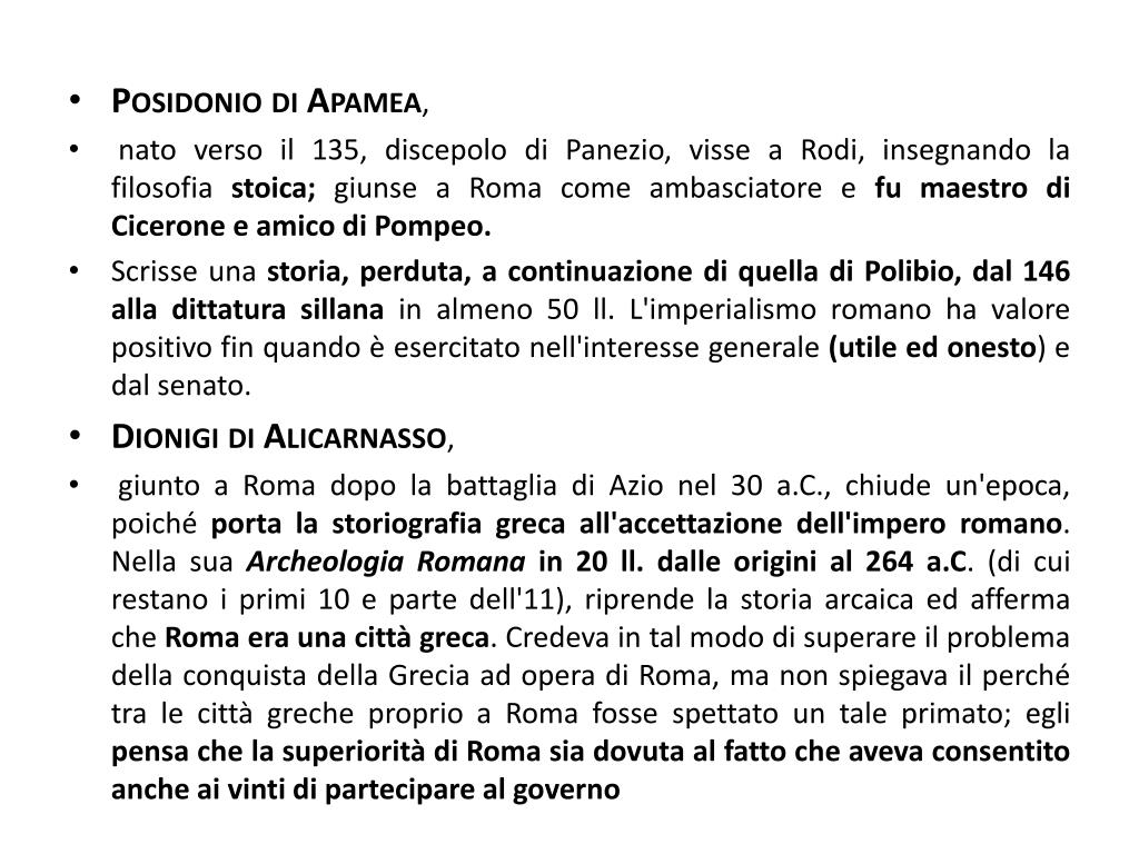 Posidonio di Apamea, • nato verso il 135, discepolo di Panezio, visse a Rodi, insegnando la filosofia stoica; giunse a Roma come ambasciatore e fu maestro di Cicerone e amico di Pompeo. • Scrisse una storia, perduta, a continuazione di quella di Polibio, dal 146 alla dittatura sillanain almeno 50 ll. L'imperialismo romano ha valore positivo fin quando è esercitato nell'interesse generale (utile ed onesto) e dal senato. • Dionigi di Alicarnasso, • giunto a Roma dopo la battaglia di Azio nel 30 a.C., chiude un'epoca, poiché porta la storiografia greca all'accettazione dell'impero romano. Nella sua Archeologia Romana in 20 ll. dalle origini al 264 a.C. (di cui restano i primi 10 e parte dell'11), riprende la storia arcaica ed afferma che Roma era una città greca. Credeva in tal modo di superare il problema della conquista della Grecia ad opera di Roma, ma non spiegava il perché tra le città greche proprio a Roma fosse spettato un tale primato; egli pensa che la superiorità di Roma sia dovuta al fatto che aveva consentito anche ai vinti di partecipare al governo
