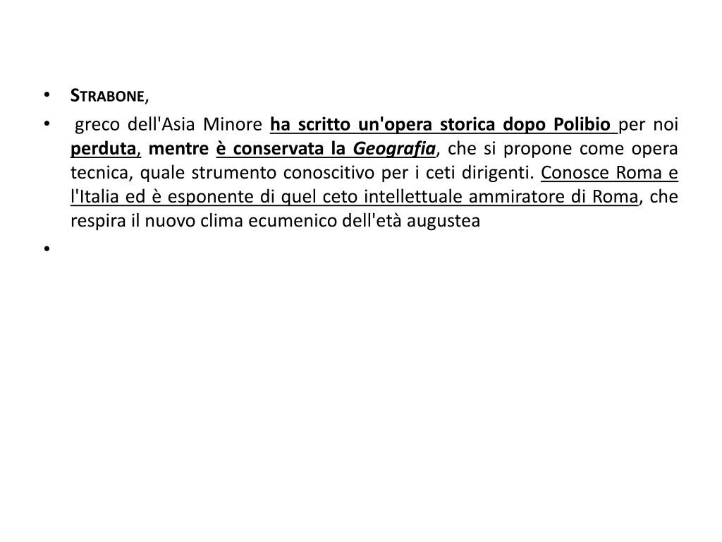 Strabone, • greco dell'Asia Minore ha scritto un'opera storica dopo Polibioper noi perduta,mentre è conservata la Geografia, che si propone come opera tecnica, quale strumento conoscitivo per i ceti dirigenti. Conosce Roma e l'Italia ed è esponente di quel ceto intellettuale ammiratore di Roma, che respira il nuovo clima ecumenico dell'età augustea