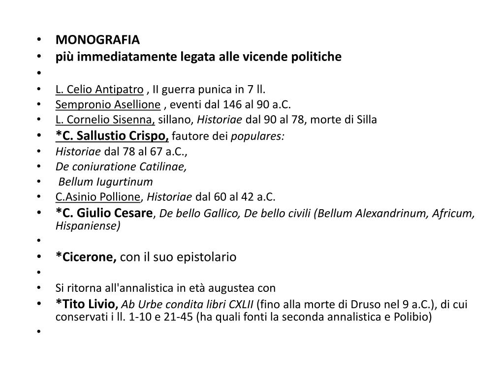 MONOGRAFIA • più immediatamente legata alle vicende politiche • L. Celio Antipatro , II guerra punica in 7 ll. • Sempronio Asellione , eventi dal 146 al 90 a.C. • L. Cornelio Sisenna,sillano, Historiae dal 90 al 78, morte di Silla • *C. Sallustio Crispo, fautore dei populares: • Historiae dal 78 al 67 a.C., • De coniurationeCatilinae, • BellumIugurtinum • C.Asinio Pollione, Historiae dal 60 al 42 a.C. • *C. Giulio Cesare, De bello Gallico, De bello civili (BellumAlexandrinum, Africum, Hispaniense) • *Cicerone, con il suo epistolario • Si ritorna all'annalistica in età augustea con • *Tito Livio, Ab Urbe condita libri CXLII (fino alla morte di Druso nel 9 a.C.), di cui conservati i ll. 1-10 e 21-45 (ha quali fonti la seconda annalistica e Polibio)