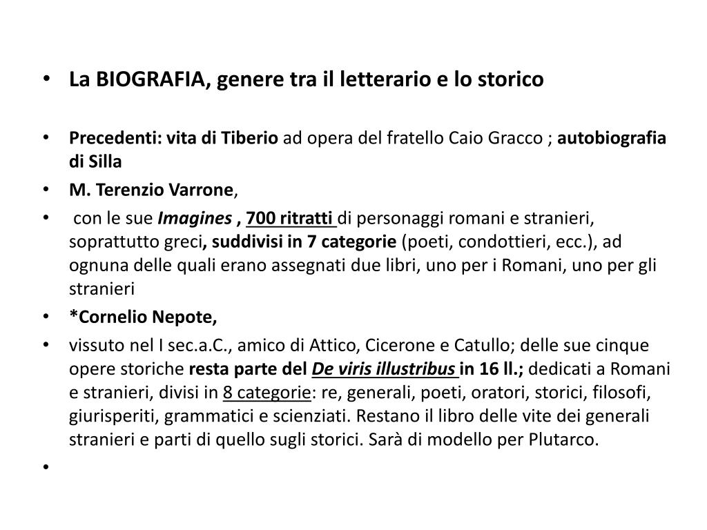 La BIOGRAFIA, genere tra il letterario e lo storico • Precedenti:vita di Tiberio ad opera del fratello Caio Gracco ; autobiografia di Silla • M. Terenzio Varrone, • con le sue Imagines , 700 ritratti di personaggi romani e stranieri, soprattutto greci, suddivisi in 7 categorie (poeti, condottieri, ecc.), ad ognuna delle quali erano assegnati due libri, uno per i Romani, uno per gli stranieri • *CornelioNepote, • vissuto nel I sec.a.C., amico di Attico, Cicerone e Catullo; delle sue cinque opere storiche resta parte del De virisillustribusin 16 ll.; dedicati a Romani e stranieri, divisi in 8 categorie: re, generali, poeti, oratori, storici, filosofi, giurisperiti, grammatici e scienziati. Restano il libro delle vite dei generali stranieri e parti di quello sugli storici. Sarà di modello per Plutarco.