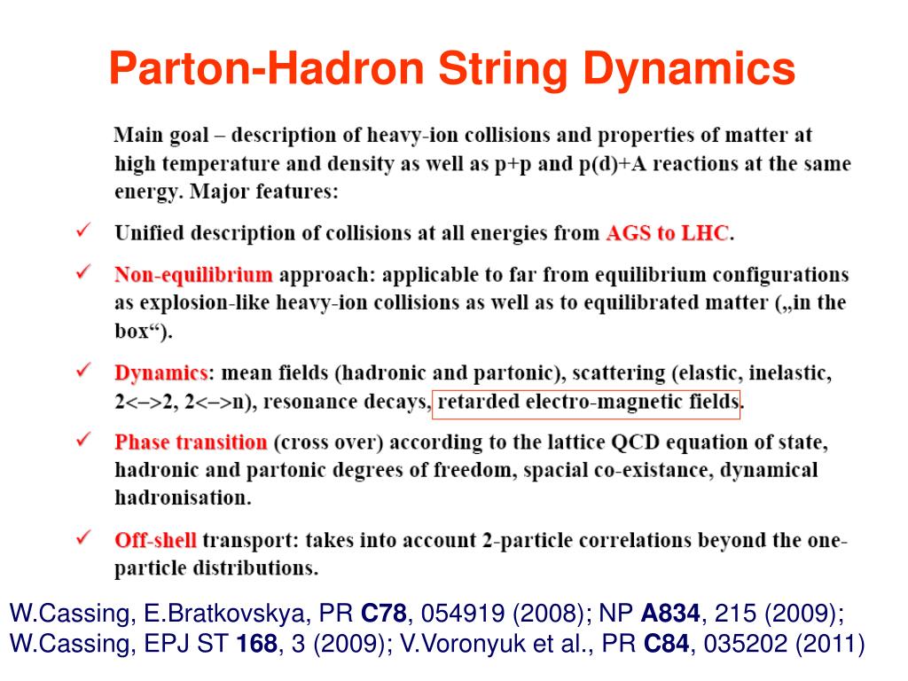 Parton-Hadron String Dynamics W.Cassing, Е.Bratkovskya, PR C78, 054919 (2008); NP A834, 215 (2009); W.Cassing, EPJ ST 168, 3 (2009); V.Voronyuk et al., PR C84, 035202 (2011)